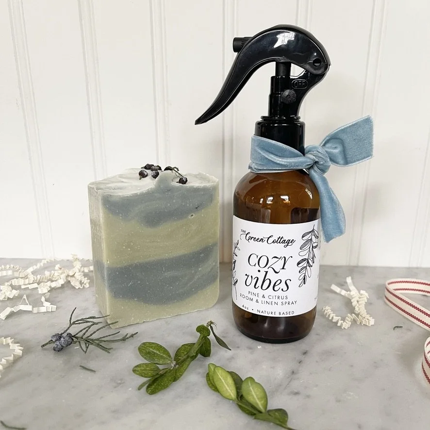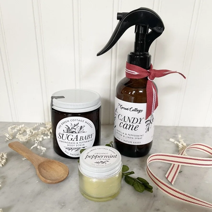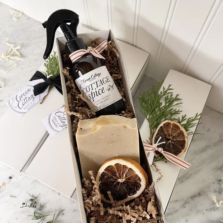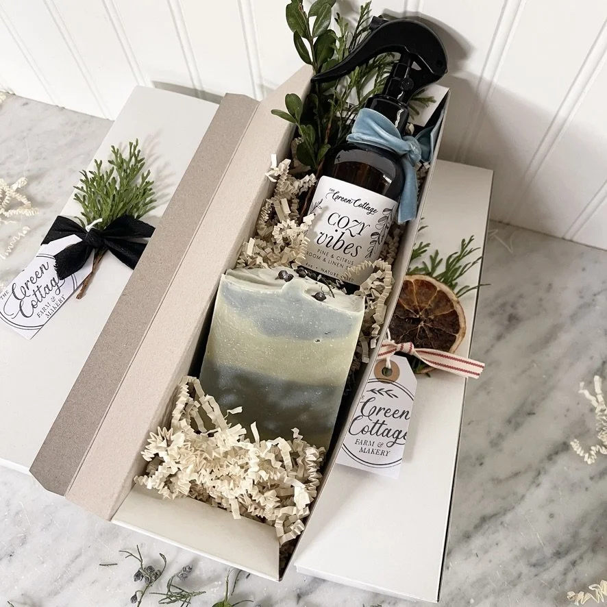 A beautifully curated box of our small-batch handmade goods tied with a cotton ribbon with greenery ready to gift.